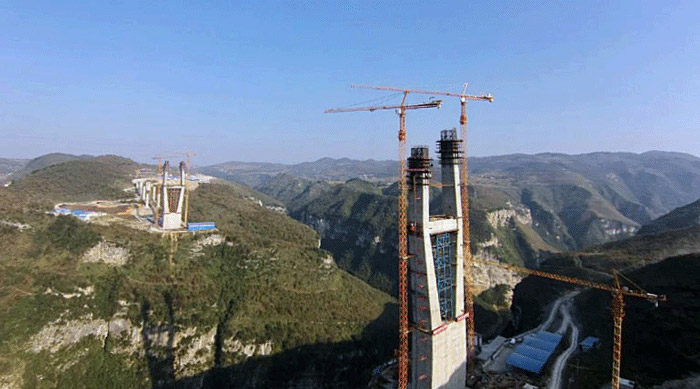 六广河特大桥是息黔高速公路最为重要,同时也是施工难度最大的控制性工程,两侧桥墩高度均为242米,每个桥墩的起重机械配置均为川建生产的两台C7030塔机和两台SC200/200WPZ中速变频施工梯。